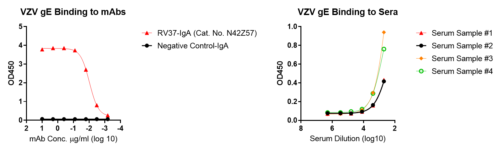 Customers who intend to use this kit to generate quantitative curves are suggested to consider the monoclonal antibodies to generate the reference curve: Recombinant Human Anti-Varicella-Zoster virus (VZV) gE IgA Antibody (Cat. No. N42Z57).