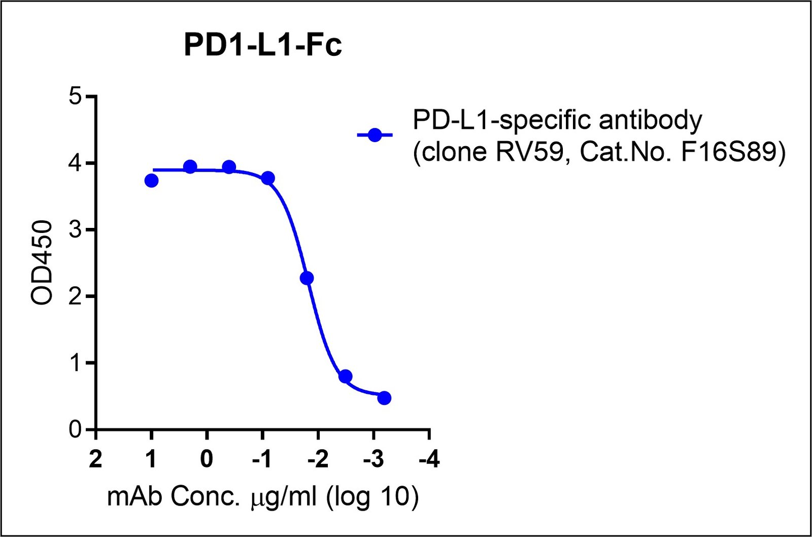 Human PD-L1 (programmed death ligand 1) is commonly expressed on dendritic cells and macrophages, and its ectodomain is composed of a membrane distal IgSF V-set and a membrane proximal IgSF C-set domain. PD-L1 is often overexpressed in different tumors, and its interaction with PD-1 on T cells enables cancer cells to evade T-cell-mediated immune responses. A recombinant form (Phe 19 – Arg 238) of PD-L1 protein (Accession: NP_054862.1) fused with human IgG1 Fc (Fc) tag at the C-terminus was produced by human embryonic kidney HEK cells, followed by purification. Sequence is available upon the request. The purity has been examined >95% as determined by reducing SDS-PAGE, where protein migrates as 60-75 kDa. We evaluated its binding to a PD-L1-specific antibody (clone RV59, Cat.No. F16S89) in ELISAs, see results.