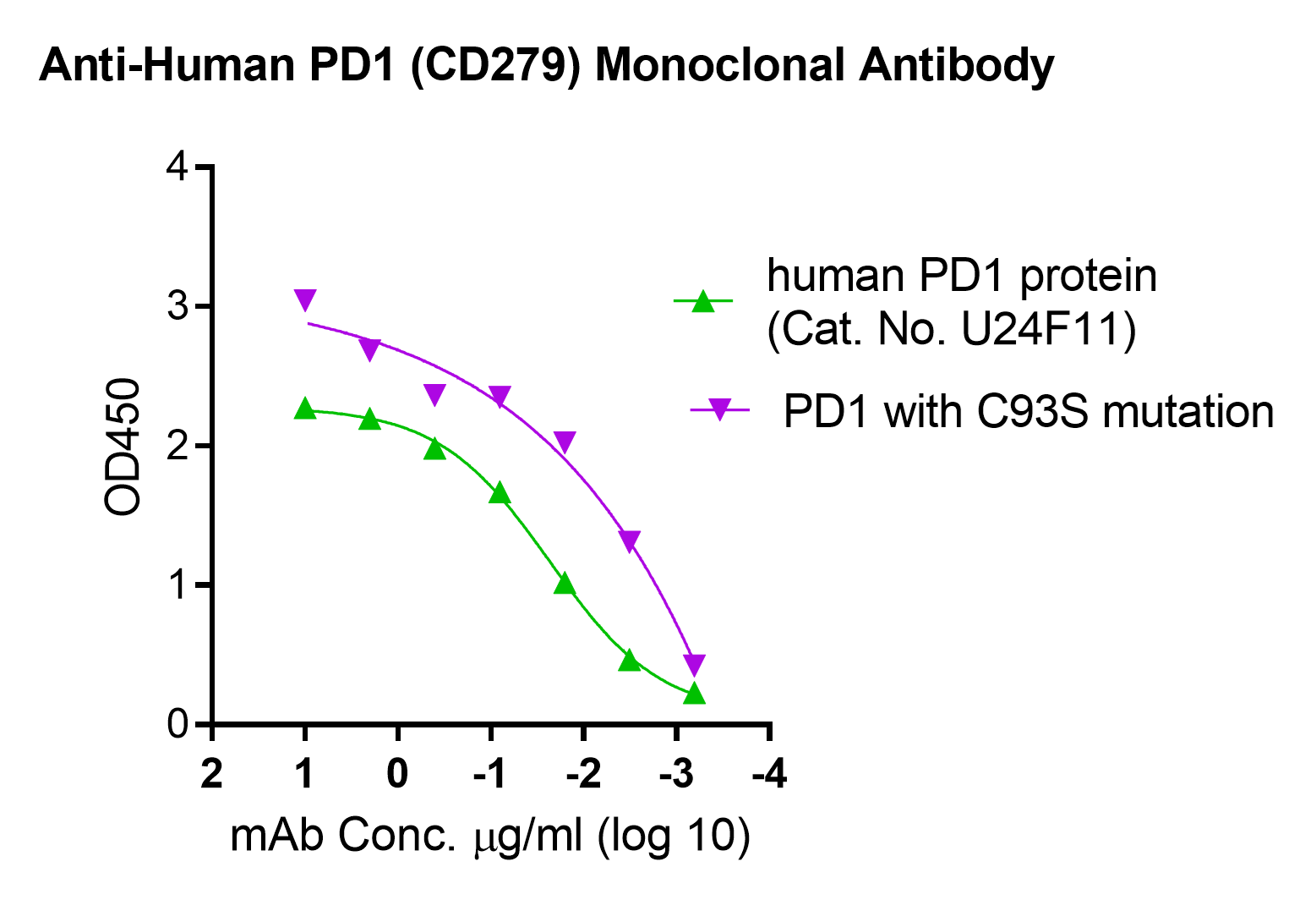 This antibody has been tested to bind to recombinant human PD1 (programmed death-1) protein (Cat. No. U24F11) or PD1 with C93S mutation in ELISA, see figure.