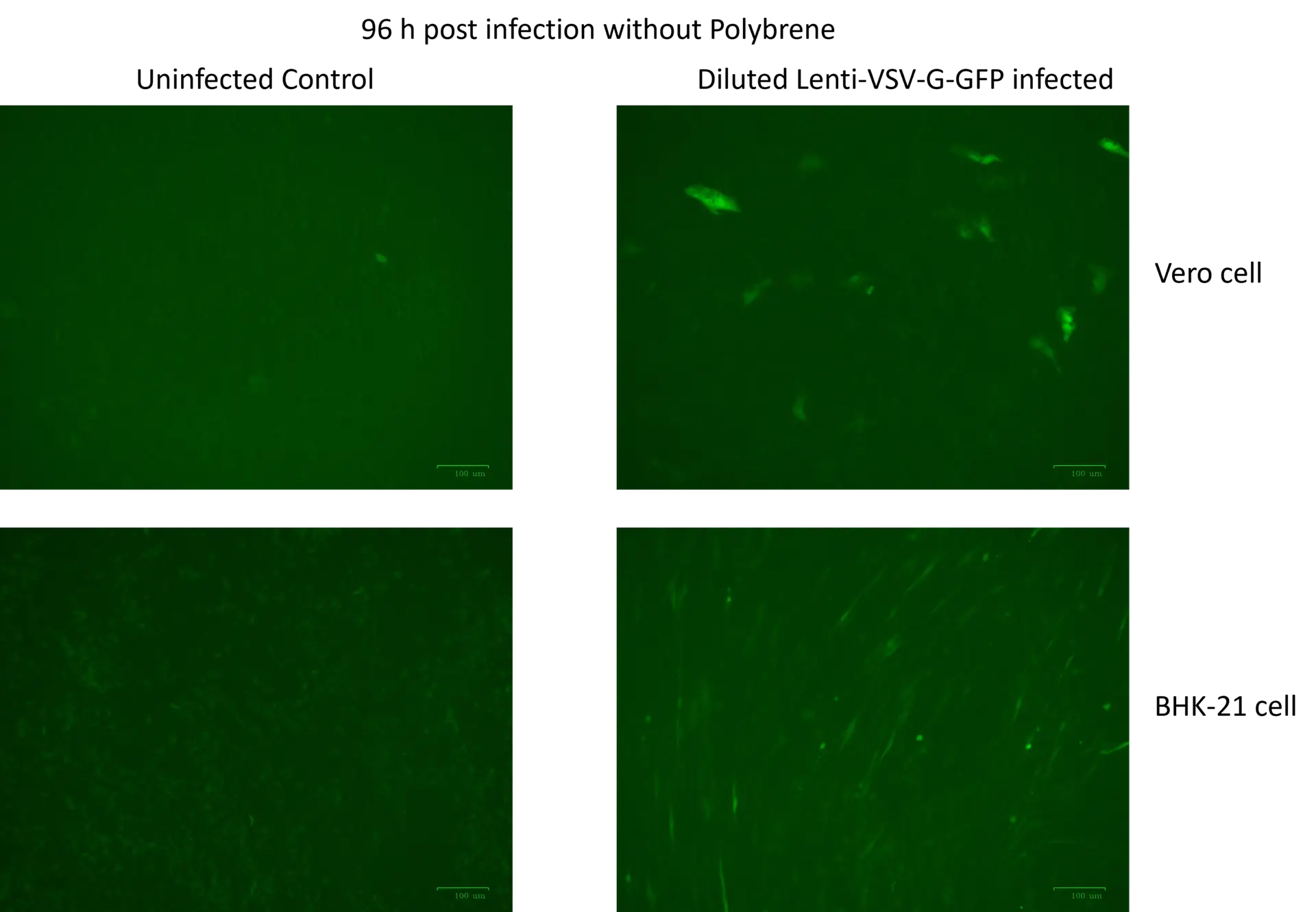 This pseudotyped virus uses lentiviral vector to carry the full-length of Vesicular Stomatitis Virus envelope G (VSV-G), which targets a broad cell range. Based on the human immunodeficiency virus-1 (HIV-1), lentivirus vector has been shown to deliver genes to neurons, lymphocytes and macrophages, cell types that previous retrovirus vectors could not be used. Lentiviral vector has also proven to be effective in transducing brain, liver, muscle, and retina in vivo without toxicity or immune responses. This GFP lentivirus control is a VSV-G-pseudotyped pantropic virus capable of infecting both dividing and non-dividing cells. Infection of cells with this pseudotyped virus carrying GFP (under control of a CMV promoter) results in GFP fluorescence (see figure) with at least 2 x 104 TU/ml (infectious titer, measured on Vero cells at 72 hours post infection). This product has no selection marker. Lentivirus service is available for higher titer per request (contact us).