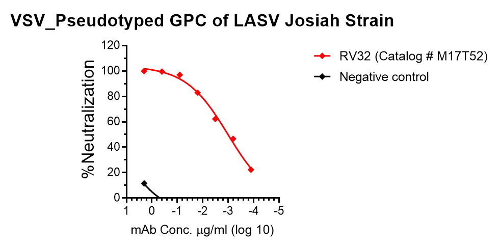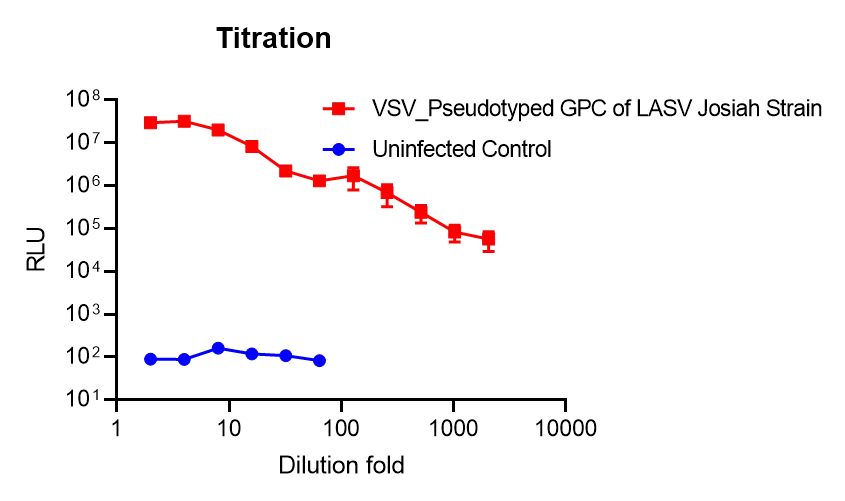 This pseudotyped virus uses recombinant vesicular stomatitis virus (rVSV) to carry glycoprotein complex (GPC) of Lassa virus (LASV) Josiah Strain (GenBank: P08669). LASV causes Lassa fever that is a severe hemorrhagic manifestations. GPC including GP1, GP2 and an unusual stable signal peptide (SSP) is responsible for receptor binding and fusion of the virion with a cell membrane. As pseudovirus infectivity of rVSV without its original G is restricted to a single round of replication, the pseudotypes can be handled using BSL-2 containment practices. Infection of cells with this pseudotyped virus carrying luciferase reporter results in high level luciferase activity. See our titration result showing that the starting 2-fold diluted pseudovirus generates signal >100,000-fold higher than uninfected control (cell alone as background in blue). We also evaluated the neutralizing activity of a neutralizing antibody RV32 (Catalog # M17T52) with a negative control by using this pseudotyped virus. The results showed the neutralization titer for RV32 is 1 ng/ml. See figure