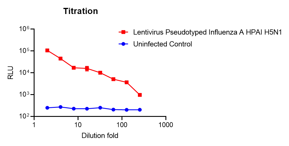 This pseudotyped virus uses lentivirus packaging to carry full length HA, NA and M of Highly Pathogenic Avian Influenza (HPAI) A virus (A/Pelecanus/Peru/VFAR-140/2022(H5N1), clade 2.3.4.4b) (GenBank: OQ565628.1). HPAI influenza H5N1 virus that is highly contagious among birds but also infect humans should be handled in BSL-4 labs. While the pseudotypes can be handled using BSL-2 containment practices. Infection of cells with this pseudotyped virus carrying luciferase reporter results in high level luciferase activity. See our titration result showing that the starting 2-fold diluted pseudovirus generates signal >100,000-fold higher than uninfected control (cell alone as background in blue). We also evaluated the neutralizing activity of one published neutralizing mAb 100F4 (Nat Commun. 2015:6:8855) and two control mAbs by using this pseudotyped virus. See figure