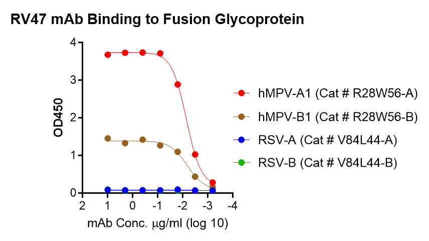 This antibody has been tested to bind to fusion (F) glycoprotein of human Metapneumovirus (hMPV) subtype A1 strain (Cat. No. R28W56-A) or B1 strain (Cat. No. R28W56-B), but not Respiratory syncytial virus (RSV) subtypes, A and B (Cat. No. V84L44).