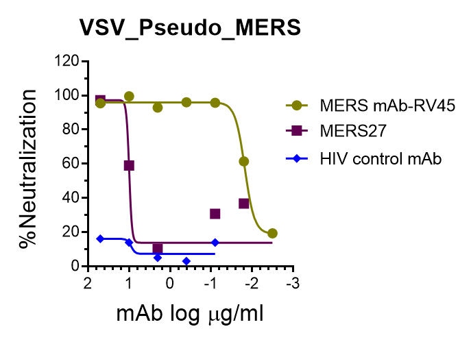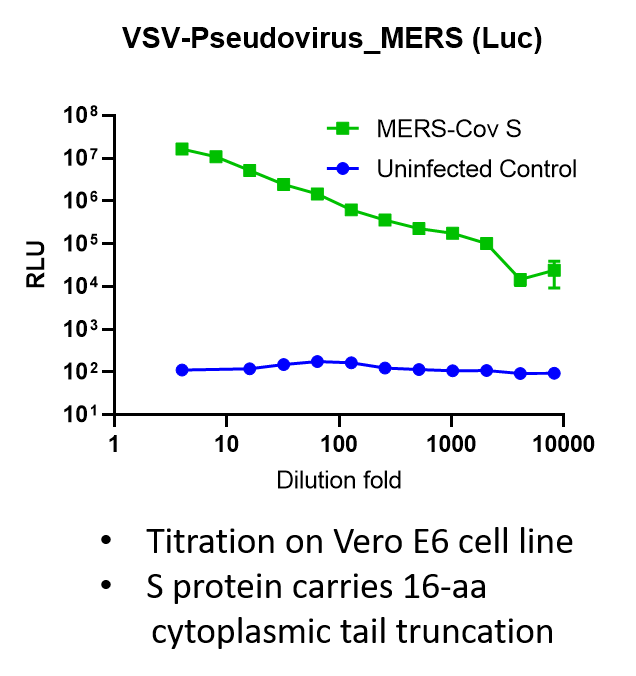 This pseudotyped virus uses recombinant vesicular stomatitis virus (rVSV) to carry S protein of Middle East respiratory syndrome coronavirus (MERS-CoV, GenBank No. JX869059.2), which was designed by codon optimizing the S sequence for mammalian expression, and had 16-aa cytoplasmic tail truncation for optimal infection. As pseudovirus infectivity of rVSV without its original G is restricted to a single round of replication, the pseudotypes can be handled using BSL-2 containment practices. Infection of cells with this pseudotyped virus carrying luciferase reporter results in high level luciferase activity. See our titration result showing the undiluted pseudovirus (green) generates signal 100,000-fold higher than uninfected control (cell alone as background in blue). We also evaluated the neutralizing activity of our MERS Positive control mAb and one published mAb called MERS27 by using this pseudotyped virus, see results.