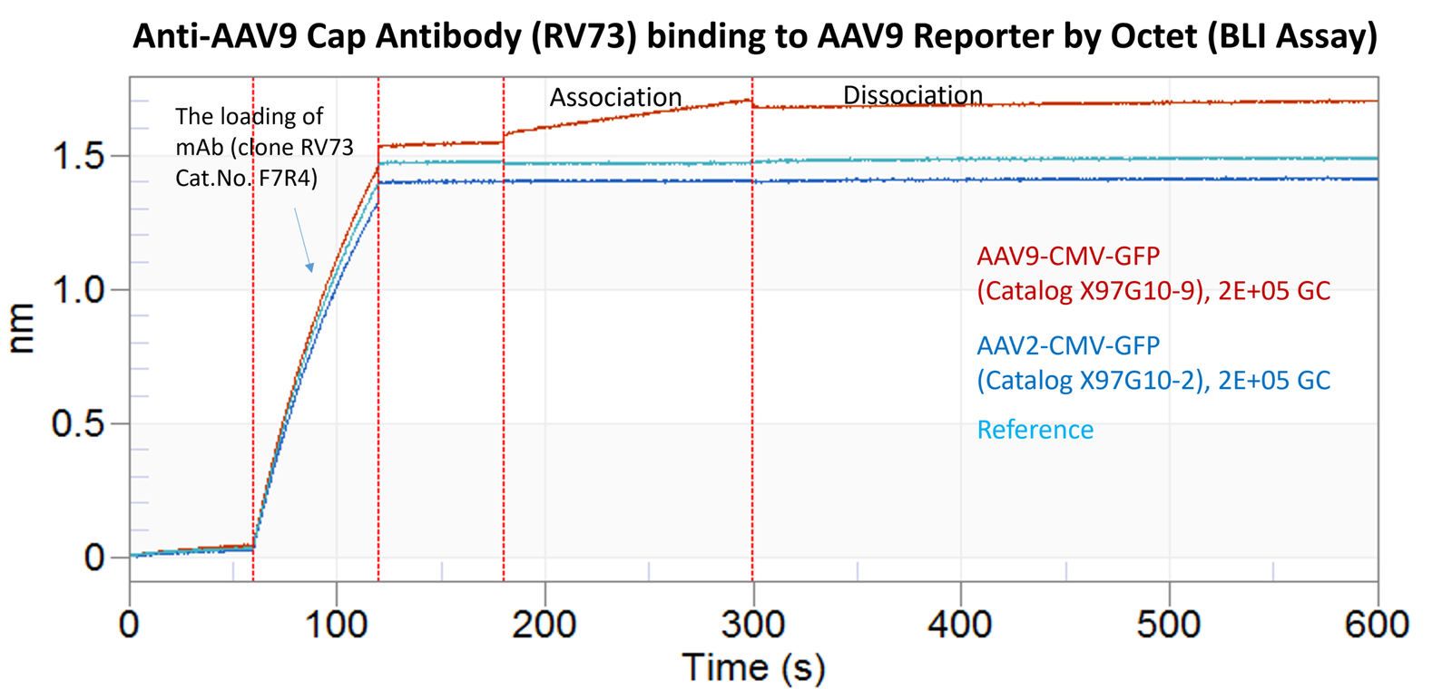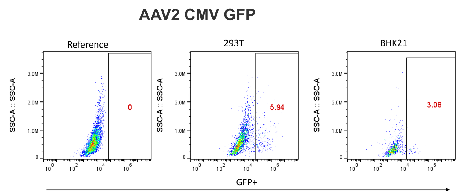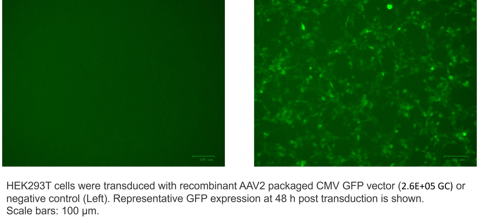 This panel of products uses CMV promoter and contains various serotype of AAV capsid (see catalog) to deliver GFP gene. The titer was measured using qPCR (The titer may vary from lot) and verified using fluorescence microscope, BLI Octet or flow cytometer, see figures.
